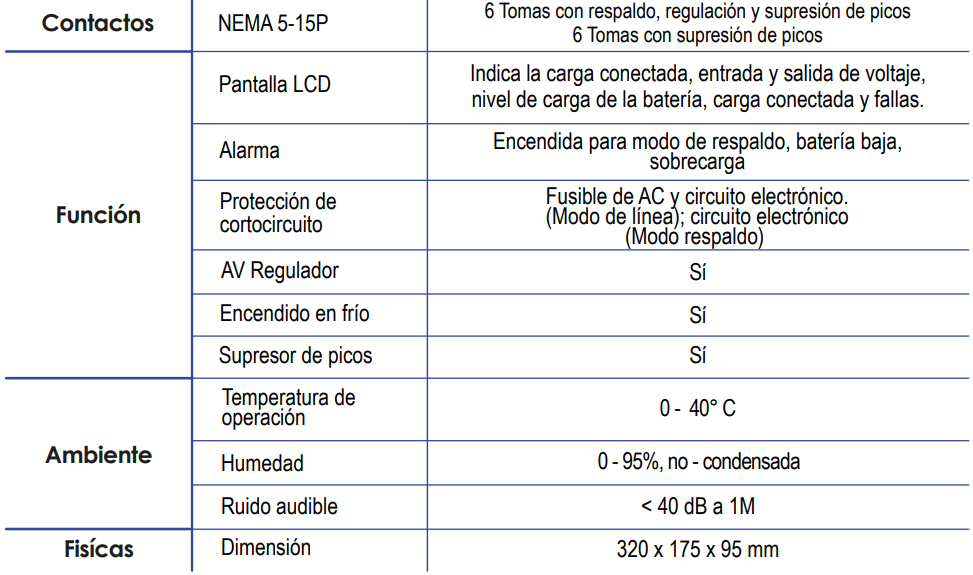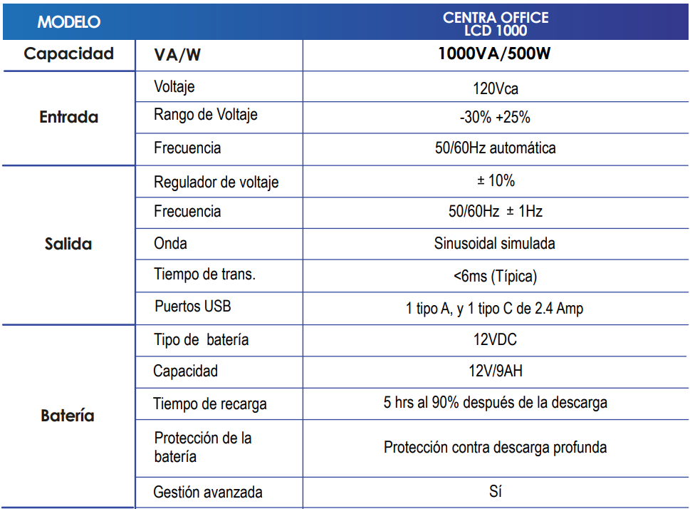 Más que un UPS, es el aliado ideal para tus requerimientos de trabajo. Con 12 contactos eléctricos, batería de fácil reemplazo y protección avanzada contra apagones, altos y bajos voltajes, picos y ruido de alta frecuencia. El CENTRA OFFICE mantiene tus dispositivos conectados, seguros y funcionando sin interrupciones. Diseñado para oficinas modernas, silencioso, compacto y listo para cuidar tu productividad. Adicionalmente cuenta con dos puertos USB (1 tipo A/1 tipo C) para carga de dispositivos móviles, protección coaxial para sistemas de Audio/Video y protección RJ45 para redes de cómputo.